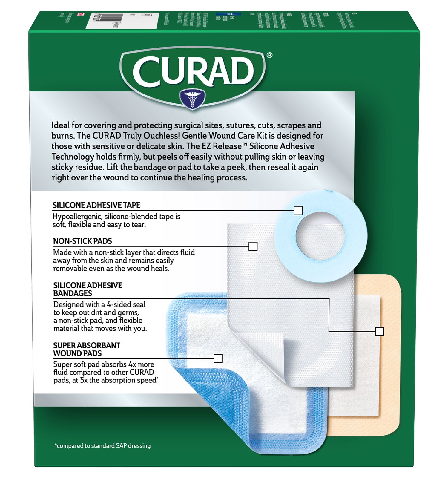 - SUPER ABSORBENT PROTECTION: CURAD Super Absorbent Wound Pads absorb 4x more fluid (compared to other CURAD Pads) at 5x the speed (compared to standard SAP dressing).