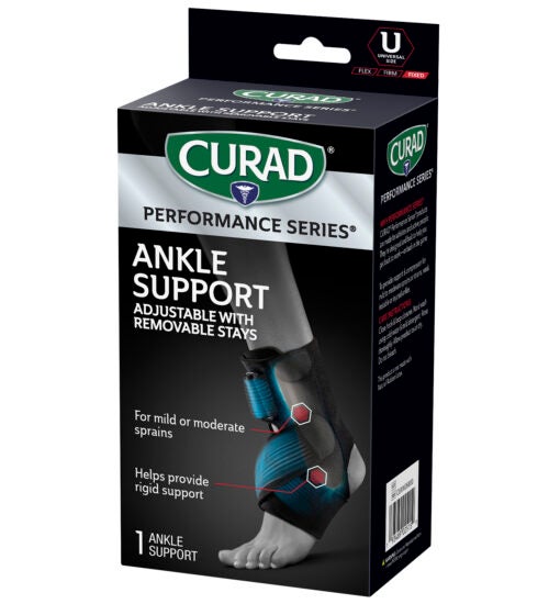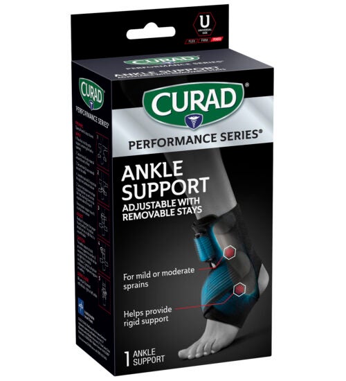 CURAD Performance Series® is the lineup of rugged supports, wraps, kinesiology tape, and bandages made to withstand the demands of active people. Every solution is designed to last through the toughest workouts and competition. The CURAD Performance Series Ankle Support with Removable Stays supports both mild and moderate ankle injuries. Rigid supports provide increased stability to both sides of the ankle, while the seamless edges and adjustable straps offer a comfortable design that’s easy to wear on the field, in the gym, at work, or out on the town.