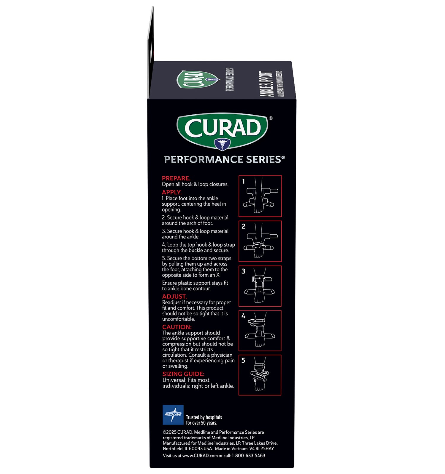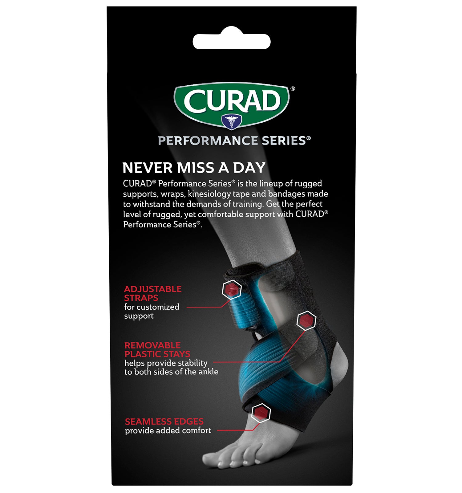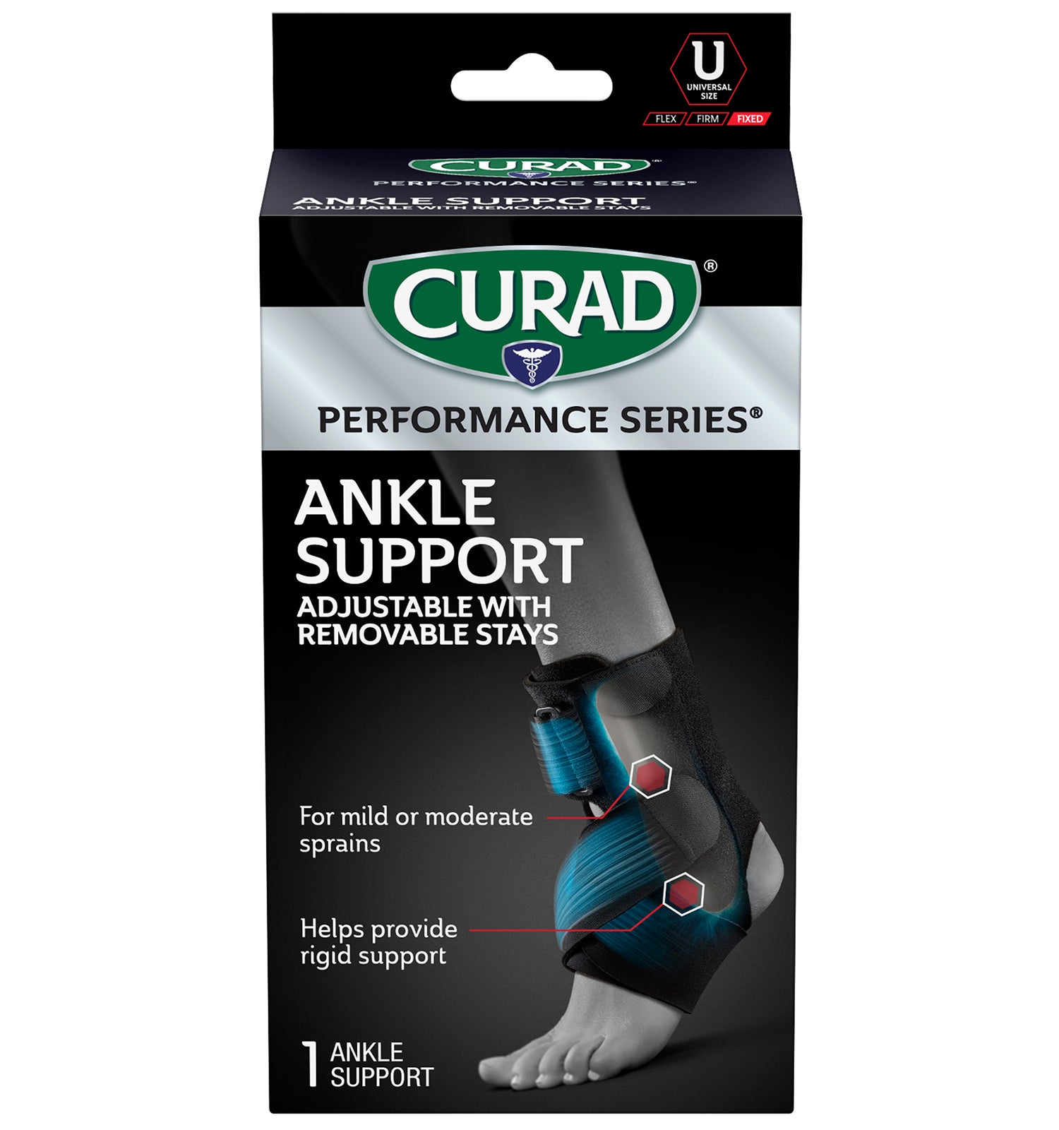 CURAD Performance Series® is the lineup of rugged supports, wraps, kinesiology tape, and bandages made to withstand the demands of active people. Every solution is designed to last through the toughest workouts and competition. The CURAD Performance Series Ankle Support with Removable Stays supports both mild and moderate ankle injuries. Rigid supports provide increased stability to both sides of the ankle, while the seamless edges and adjustable straps offer a comfortable design that’s easy to wear on the field, in the gym, at work, or out on the town.