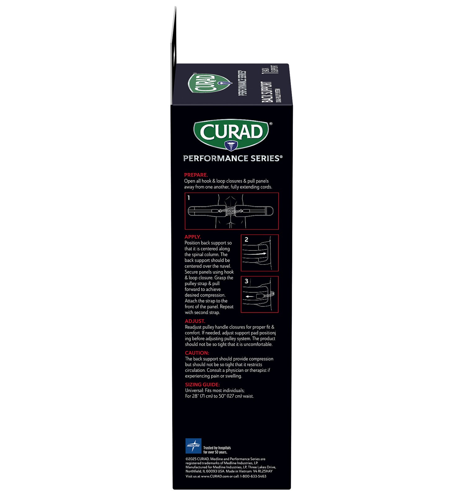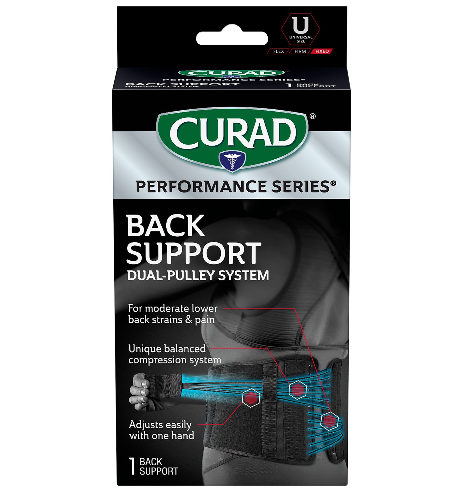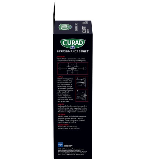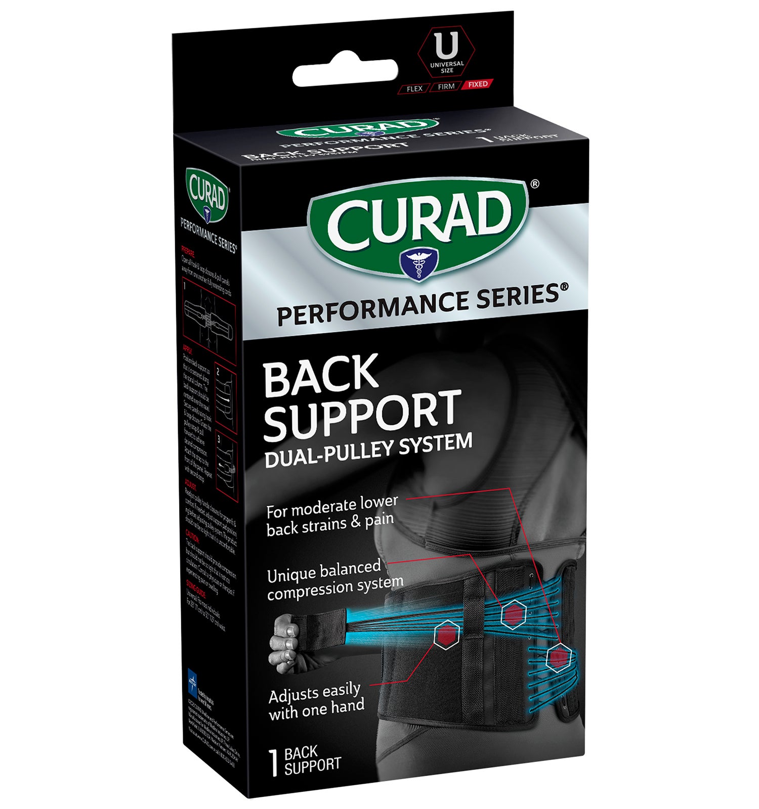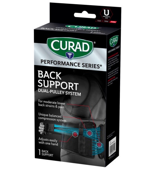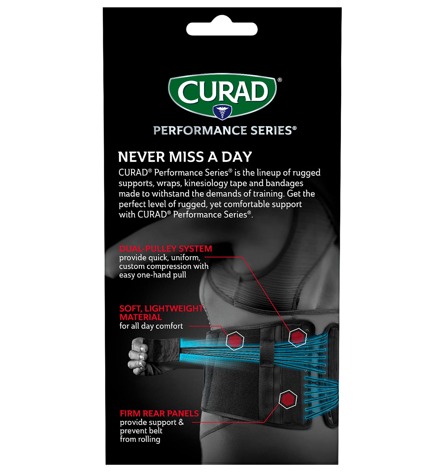 CURAD Performance Series® is the lineup of rugged supports, wraps, kinesiology tape and bandages made to withstand the demands of active people. Every solution is designed to last through the toughest workouts and competition. The CURAD Performance Series Back Support with Dual-Pulley System provides strong support and easily customized compression with its metal stays and dual-pulley system. Its low-profile design is comfortable and easy to wear on the field, in the gym, at work, or out on the town. Ideal for pulled muscles, sprains or strains.