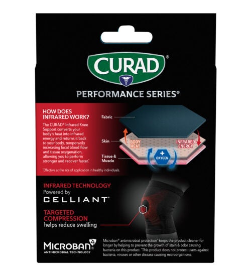 CURAD Performance Series® is the lineup of rugged supports, wraps, kinesiology tape and bandages made to withstand the demands of active people. Every solution is designed to last through the toughest workouts and competition. The CURAD Performance Series Infrared Elastic Knee Support converts your body’s heat into infrared energy and returns it back to your body, temporarily increasing local blood flow and tissue oxygenation, allowing you to perform stronger and recover faster.* Microban® antimicrobial protection** keeps the product cleaner for longer by helping to prevent the growth of stain & odor causing bacteria on this product.