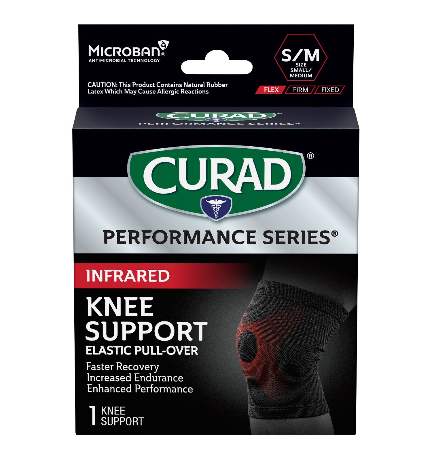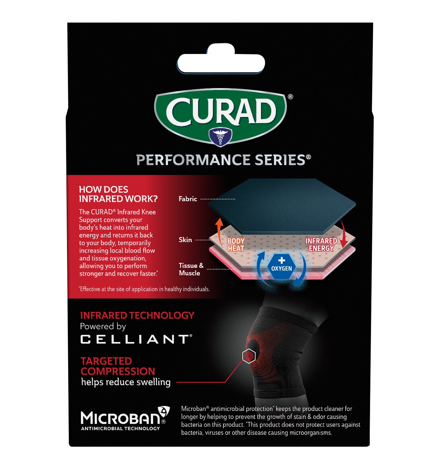 CURAD Performance Series® is the lineup of rugged supports, wraps, kinesiology tape and bandages made to withstand the demands of active people. Every solution is designed to last through the toughest workouts and competition. The CURAD Performance Series Infrared Elastic Knee Support converts your body’s heat into infrared energy and returns it back to your body, temporarily increasing local blood flow and tissue oxygenation, allowing you to perform stronger and recover faster.* Microban® antimicrobial protection** keeps the product cleaner for longer by helping to prevent the growth of stain & odor causing bacteria on this product.