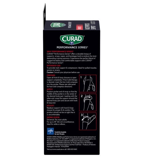 CURAD Performance Series® is the lineup of rugged supports, wraps, kinesiology tape and bandages made to withstand the demands of active people. Every solution is designed to last through the toughest workouts and competition. The CURAD Performance Series Infrared Multipurpose Support with Hot/Cold Therapy provides support for a wide range of conditions and injuries, including pain in your arm, elbow, lower leg or ankle. New Infrared Technology converts your body’s heat into infrared energy and returns it back to your body, temporarily increasing local blood flow and tissue oxygenation, allowing you to perform stronger and recover faster.* Each support includes a removable gel compress that can be cooled or heated to further reduce swelling and discomfort. Microban® antimicrobial protection** keeps the product cleaner for longer by helping to prevent the growth of stain & odor causing bacteria on this product.