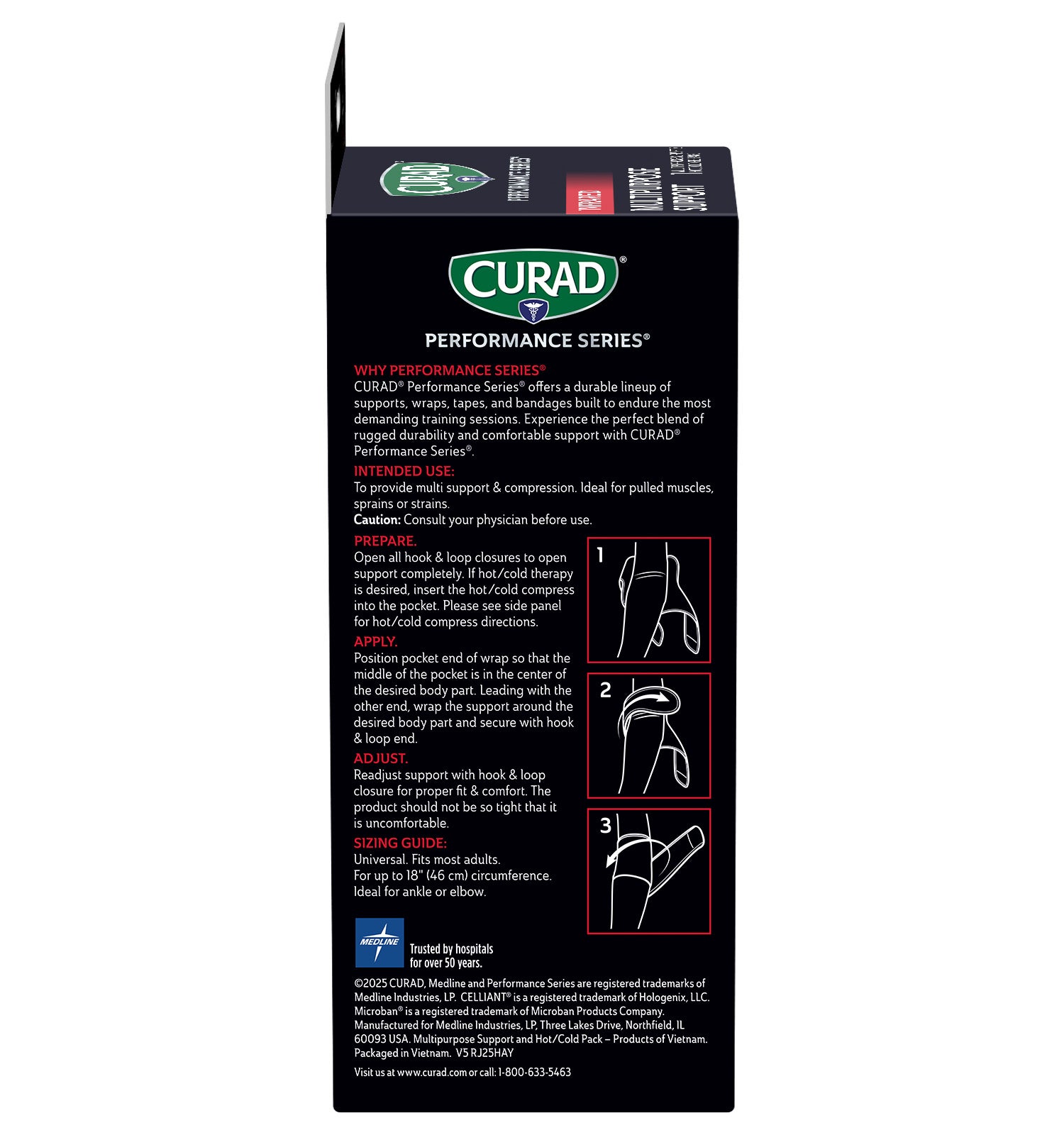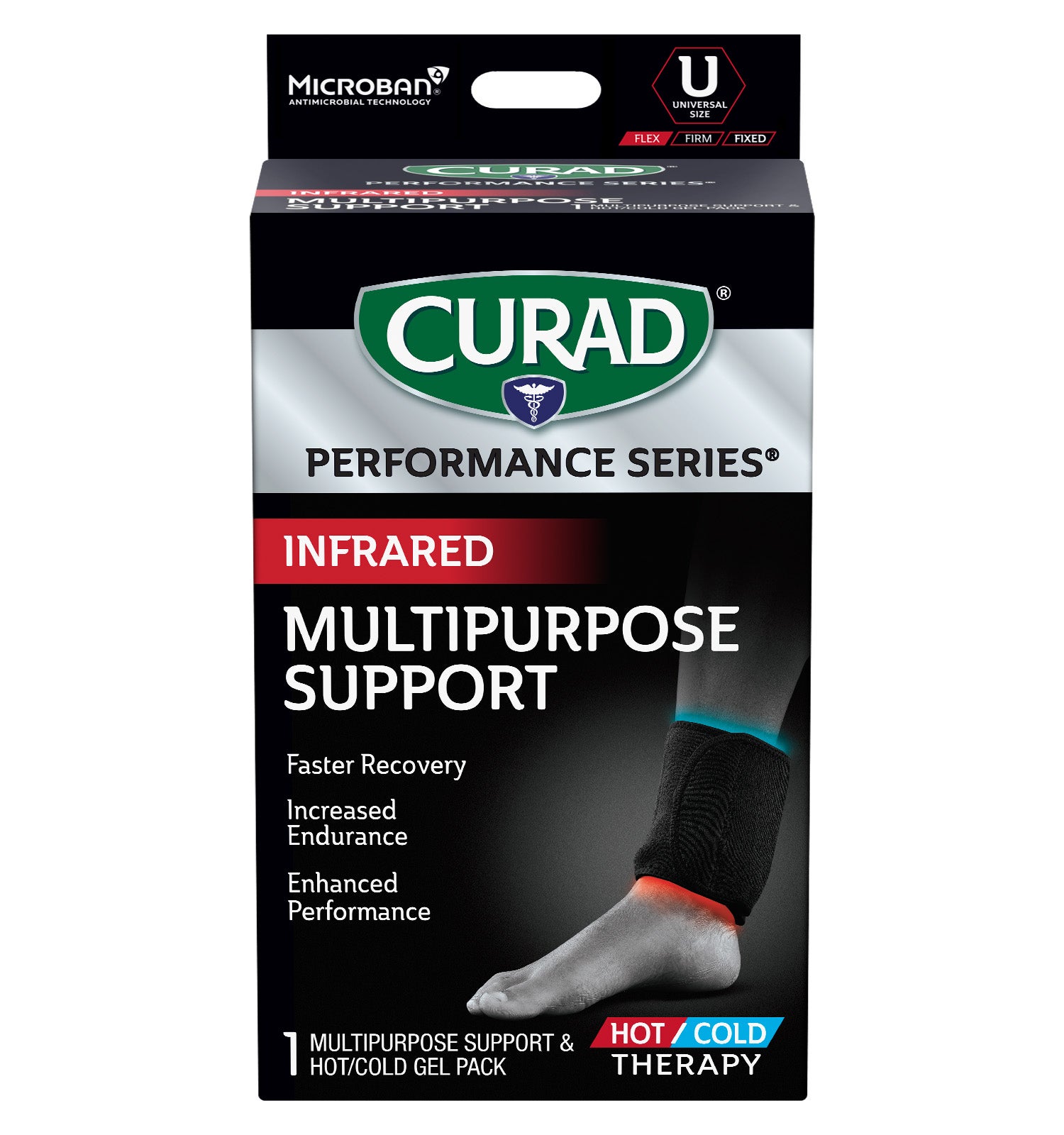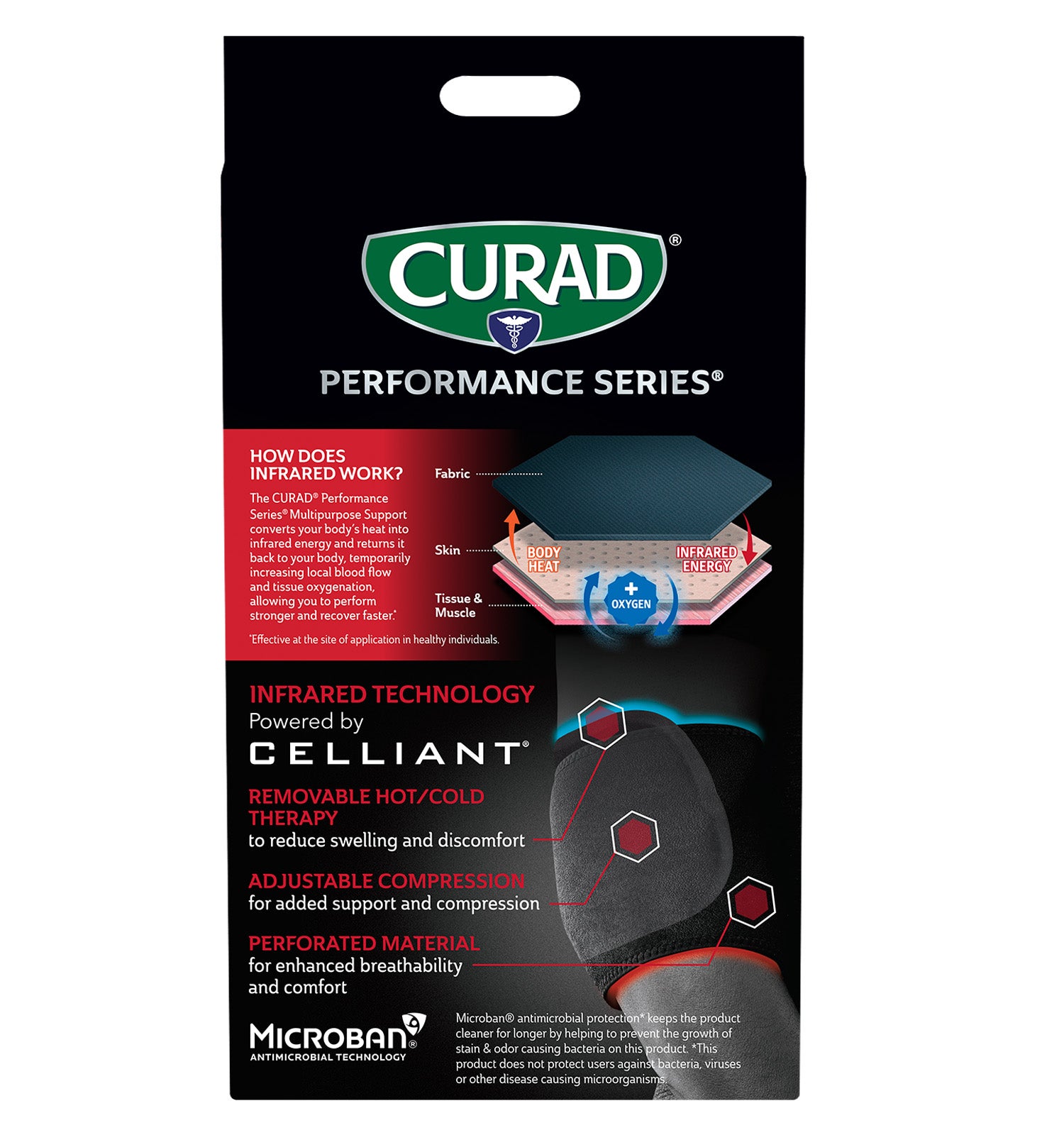 CURAD Performance Series® is the lineup of rugged supports, wraps, kinesiology tape and bandages made to withstand the demands of active people. Every solution is designed to last through the toughest workouts and competition. The CURAD Performance Series Infrared Multipurpose Support with Hot/Cold Therapy provides support for a wide range of conditions and injuries, including pain in your arm, elbow, lower leg or ankle. New Infrared Technology converts your body’s heat into infrared energy and returns it back to your body, temporarily increasing local blood flow and tissue oxygenation, allowing you to perform stronger and recover faster.* Each support includes a removable gel compress that can be cooled or heated to further reduce swelling and discomfort. Microban® antimicrobial protection** keeps the product cleaner for longer by helping to prevent the growth of stain & odor causing bacteria on this product.