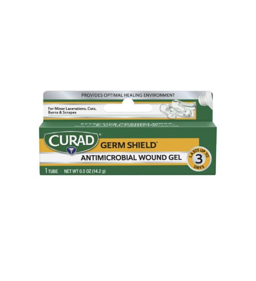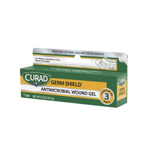 CURAD GERM SHIELD antimicrobial wound gel was formulated to effectively kill a broad spectrum of microorganisms. Its active ingredient, silver, destroys the proteins in bacterial cell walls and wipes out bacteria like MRSA, E. Coli and Candida. Keeping your wound germ-free is necessary for healing to happen quickly and completely. The hydrogel goes over your skin smoothly and absorbs thoroughly without leaving a greasy residue. It is non-staining, which means your wound will have the optimal environment for healing to take place. You can use this for minor cuts, scrapes, and burns.