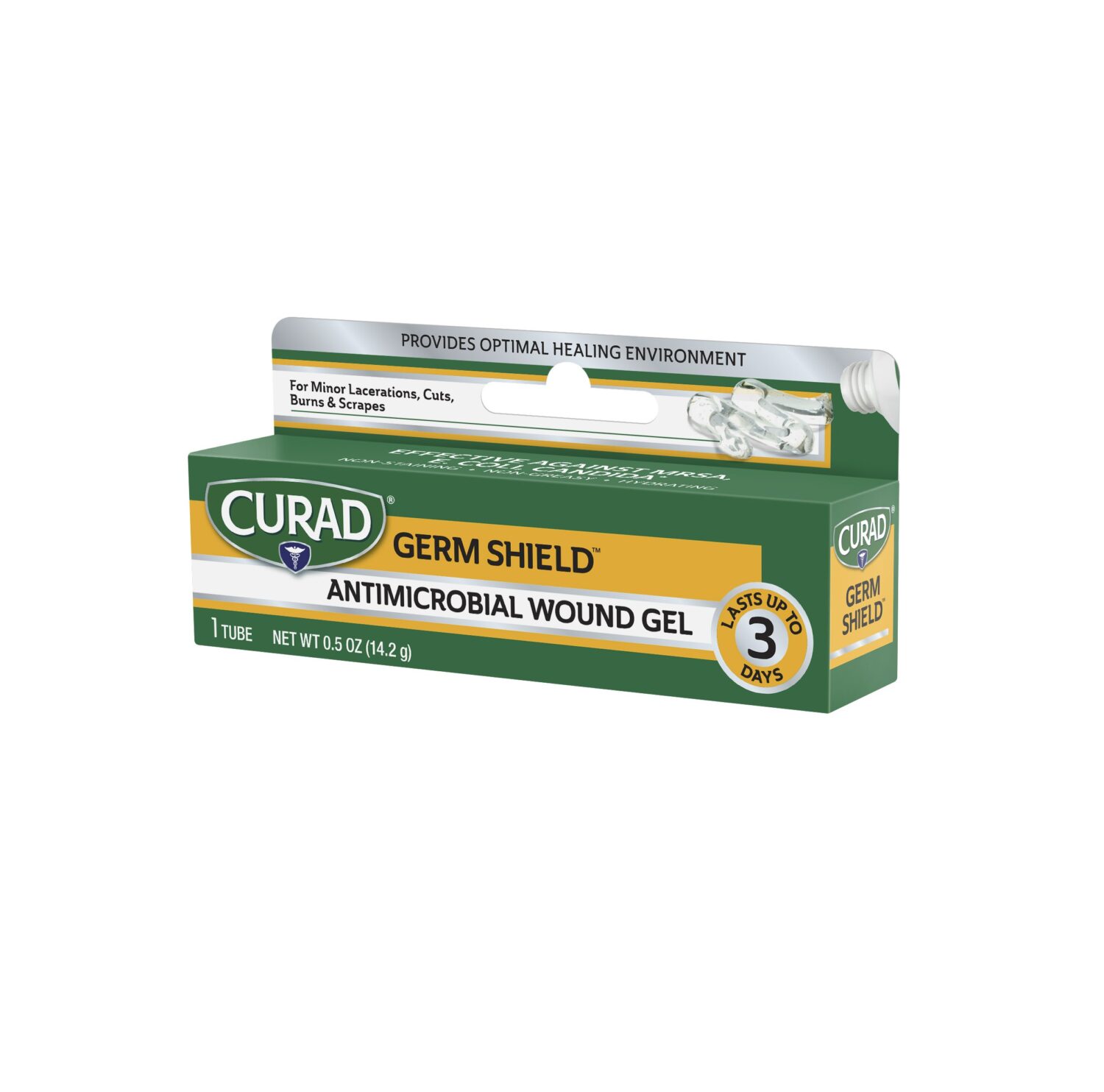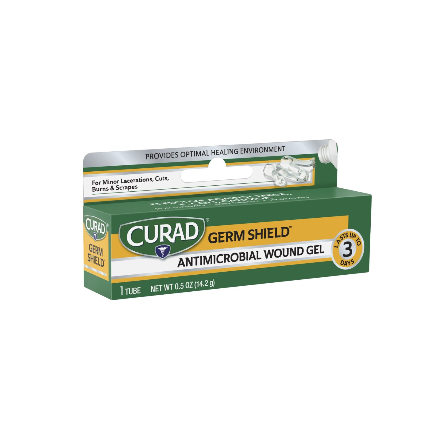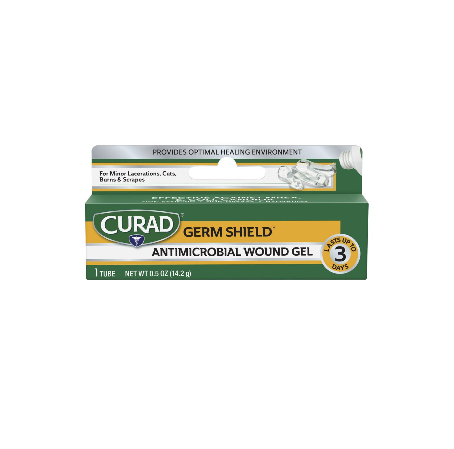 CURAD GERM SHIELD antimicrobial wound gel was formulated to effectively kill a broad spectrum of microorganisms. Its active ingredient, silver, destroys the proteins in bacterial cell walls and wipes out bacteria like MRSA, E. Coli and Candida. Keeping your wound germ-free is necessary for healing to happen quickly and completely. The hydrogel goes over your skin smoothly and absorbs thoroughly without leaving a greasy residue. It is non-staining, which means your wound will have the optimal environment for healing to take place. You can use this for minor cuts, scrapes, and burns.