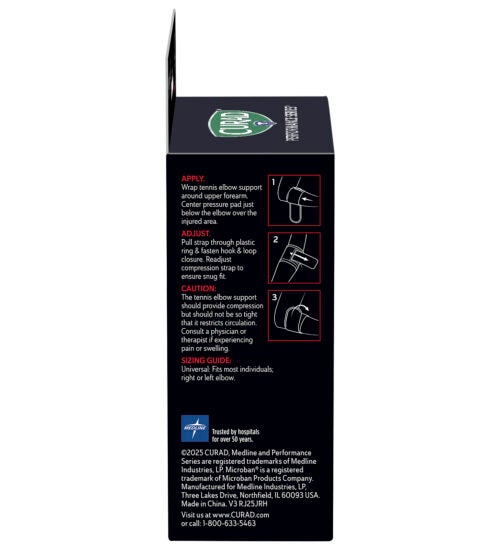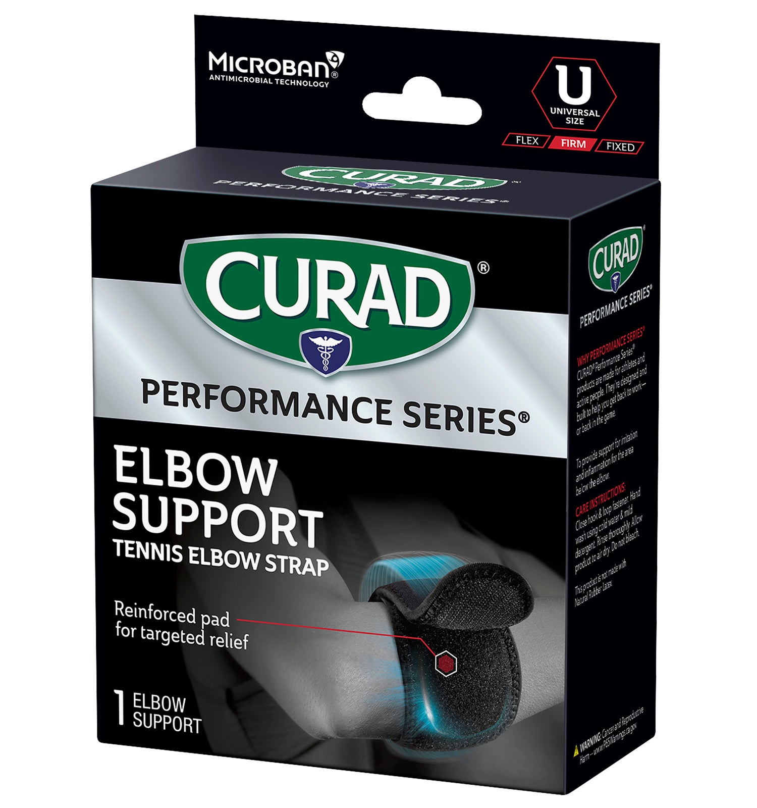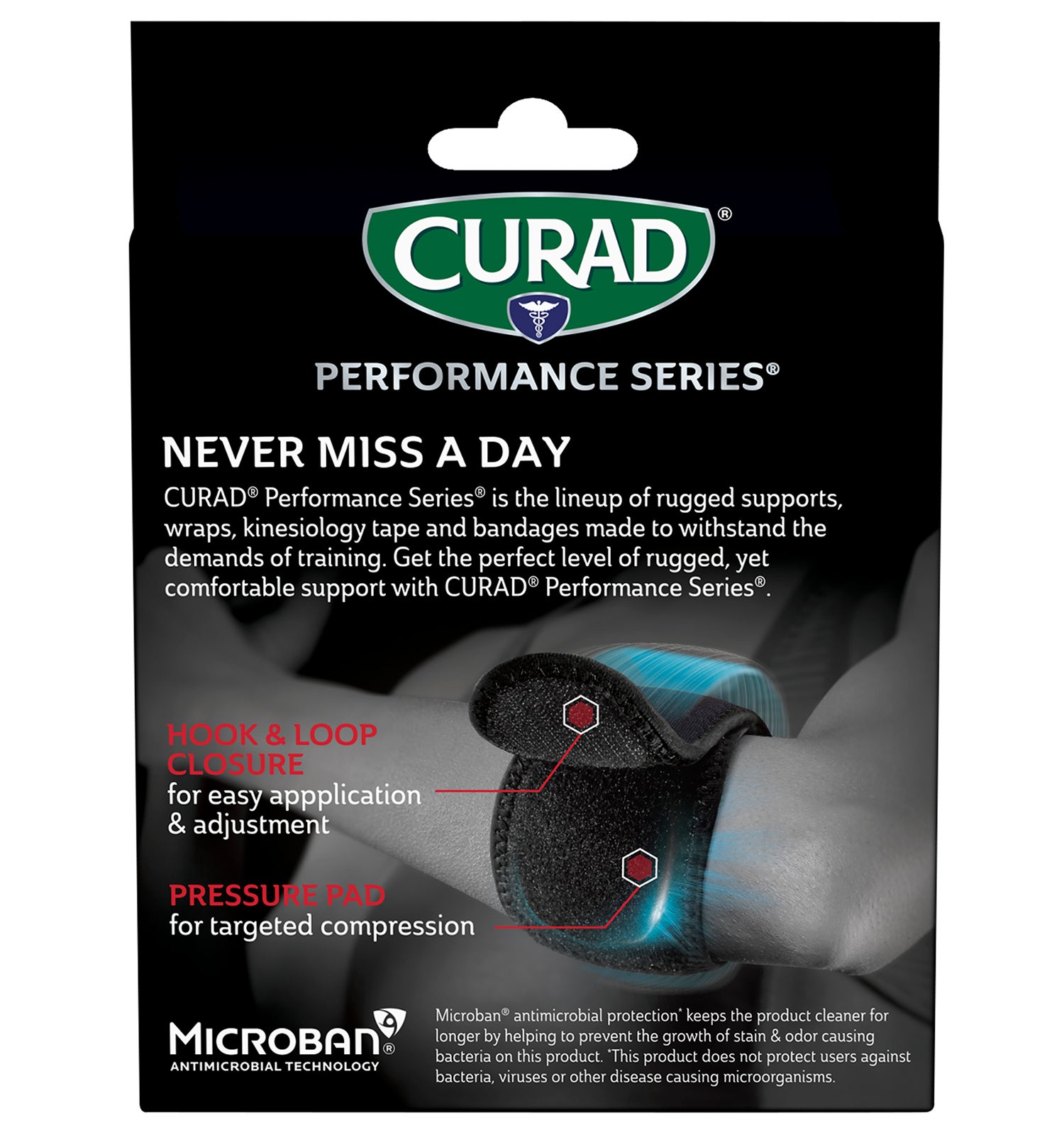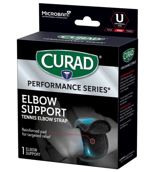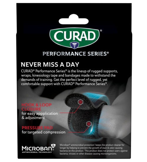CURAD® Performance Series Elbow Support – Tennis Elbow – provides relief for pain due to repetitive motions of the wrist and arm. Ideal for athletes and active people, the Elbow Support is designed to help you get back to work or back in the game. It features a Tennis Elbow strap with a built-in reinforced compression pad for targeted relief. The pad also contains Microban® Antimicrobial Protection*, which keeps the product cleaner for longer by helping to prevent the growth of stain & odor causing bacteria on this product.