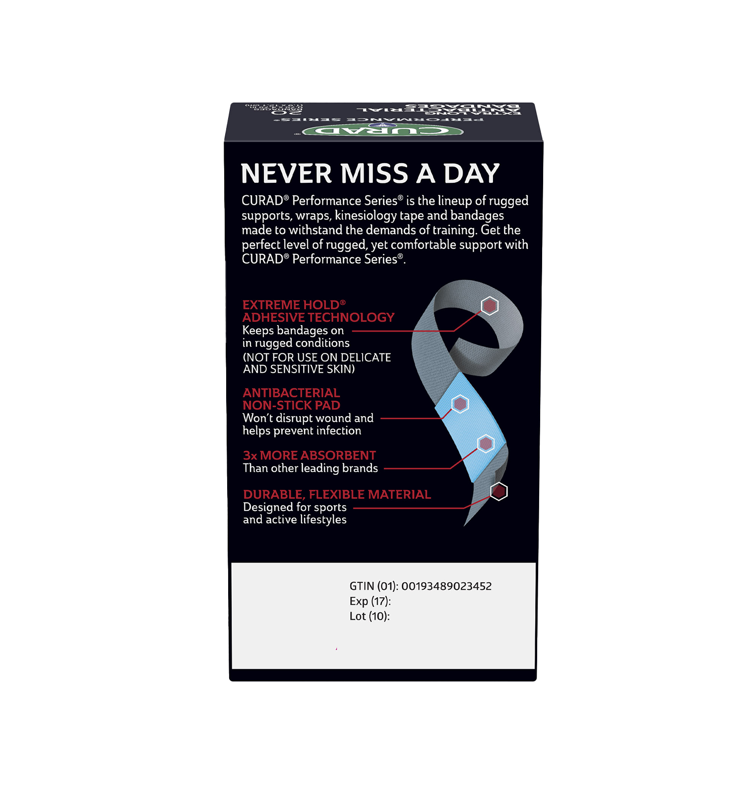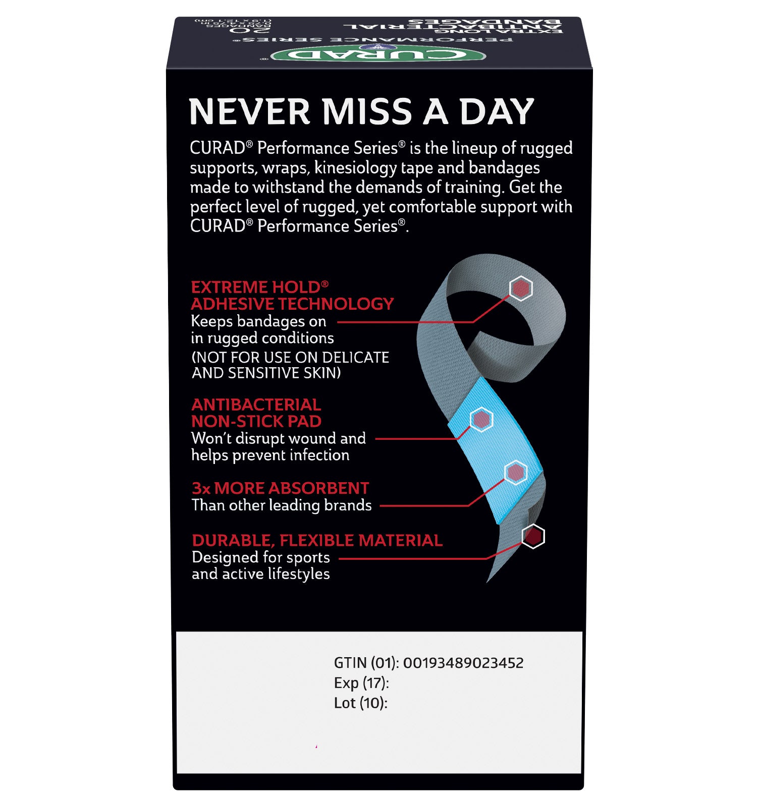CURAD® Performance Series® bandages are designed for use in rugged conditions and are made for athletes and active people. They feature Extreme Hold® adhesive technology, which is designed to provide long-lasting protection. The heavy-duty fabric is also breathable and flexible. The antibacterial non-stick pad won’t disrupt your wound and helps to prevent infection.