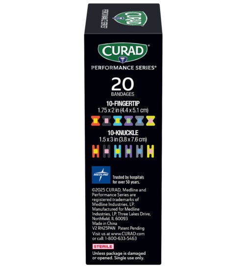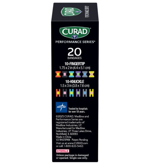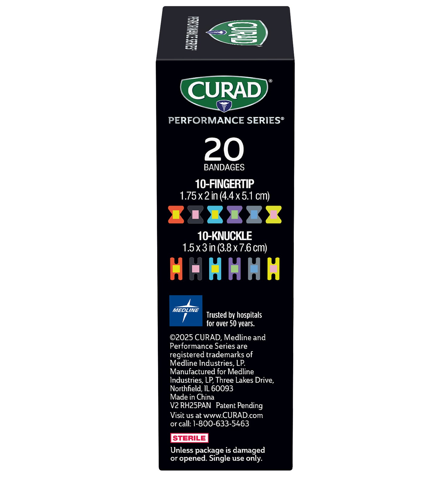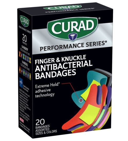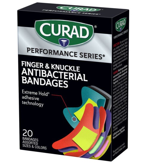 CURAD® Performance Series® Assorted Colors Finger/Knuckle Antibacterial Bandages have hourglass and butterfly shapes that make them ideal for protecting fingers and knuckles. They feature Extreme Hold™ Adhesive Technology to provide athletes and active people the lasting protection they need in rugged conditions. The heavy-duty fabric is built to last and designed to move with you.The antibacterial non-stick pad won’t disrupt your wound and helps prevent any infection.