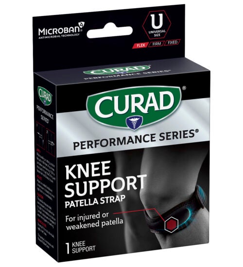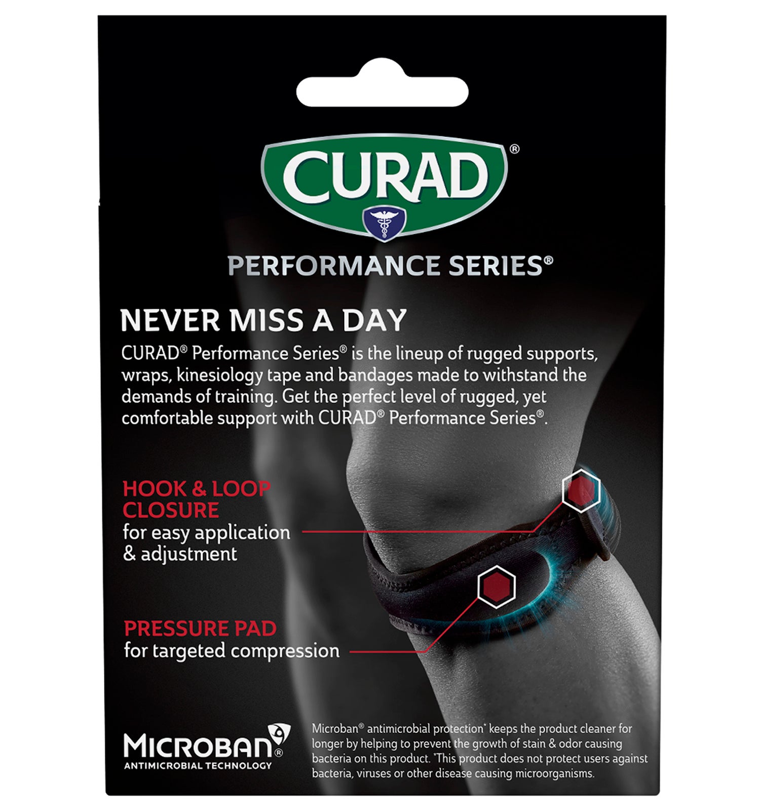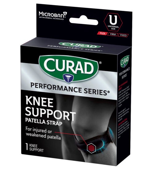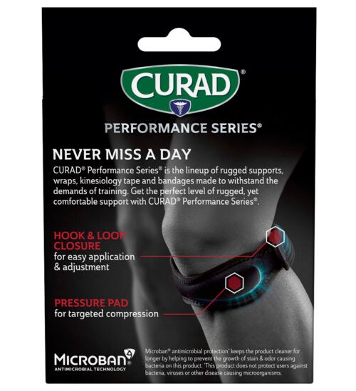 CURAD® Performance Series products help both active individuals and avid athletes quickly get back to work or back in the game. Performance Series Knee Support – Patella Strap adds specialized support to this universally sized product. Fastening just below the kneecap, this Patella Strap provides targeted relief for damaged kneecaps and helps alleviate the discomfort associated with Osgood-Schlatter Disease. Microban® antimicrobial protection* keeps the product cleaner for longer by helping to prevent the growth of stain & odor causing bacteria on this product.