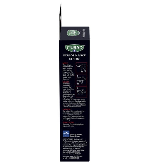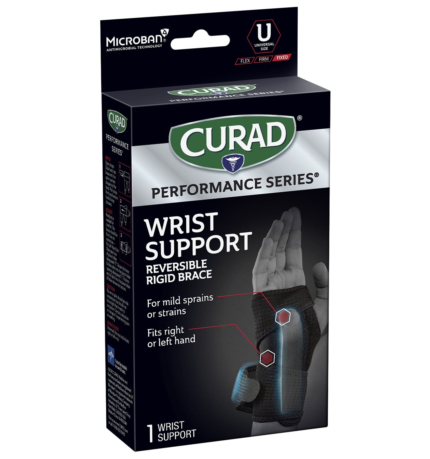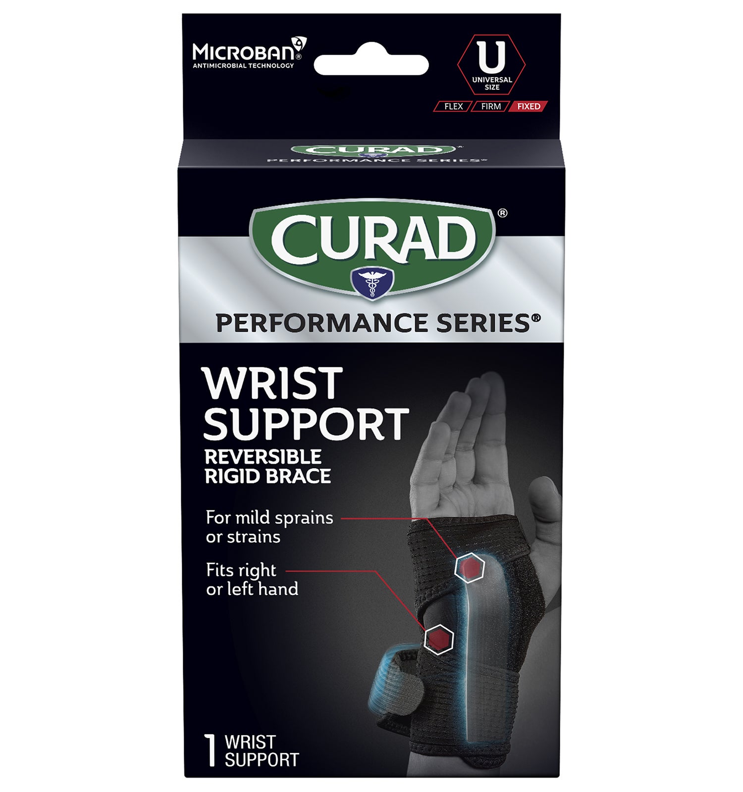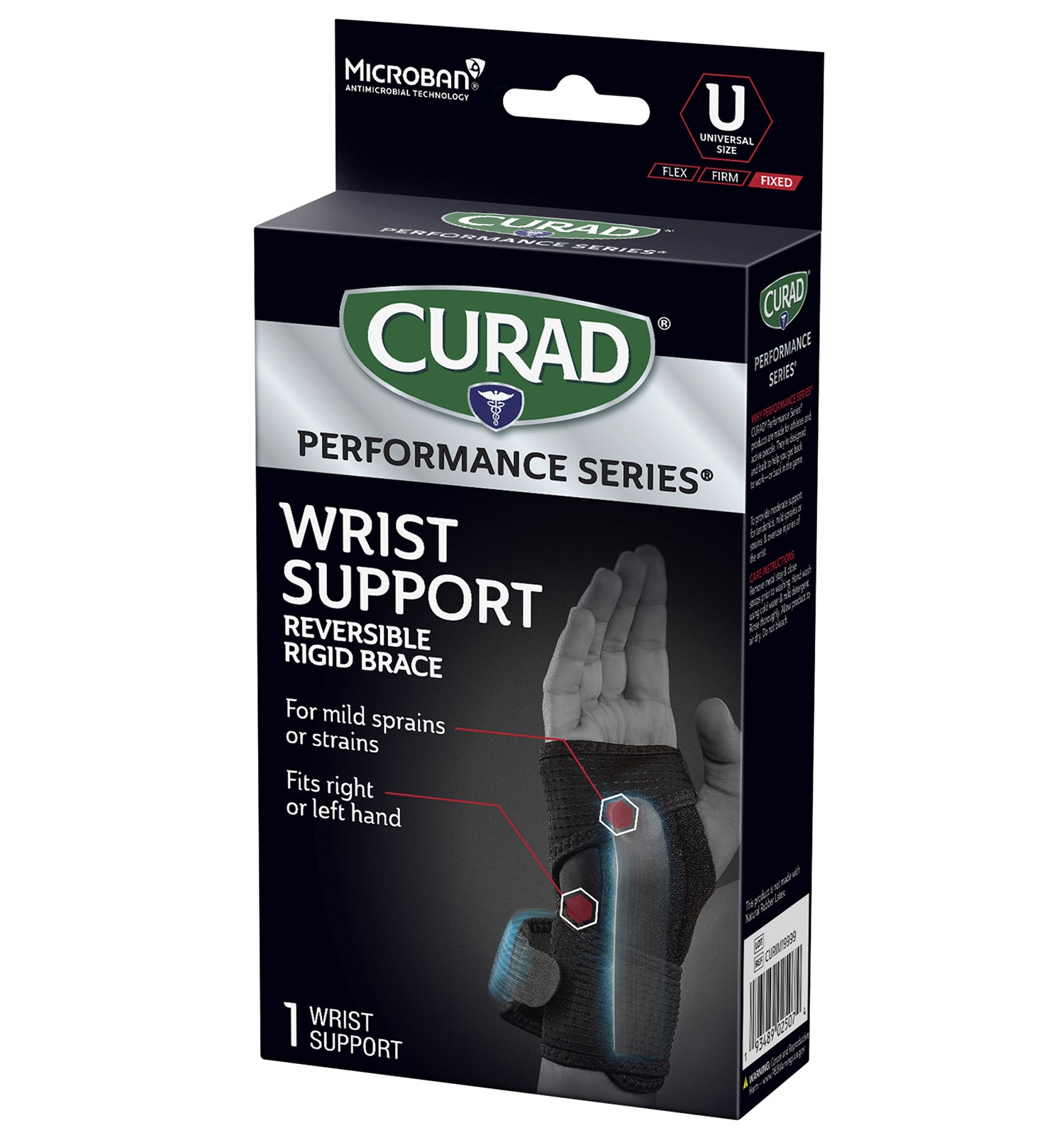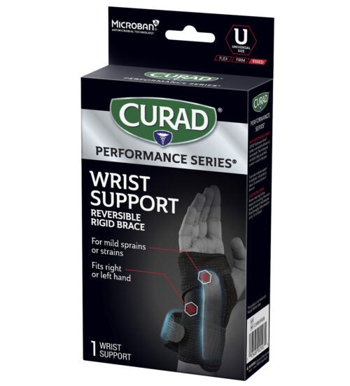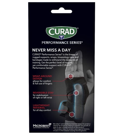 CURAD Performance Series® is the lineup of rugged supports, wraps, kinesiology tape, and bandages made to withstand the demands of active people. Every solution is designed to last through the toughest workouts and competition. The CURAD Performance Series Wrist Support provides rigid wrist support so that those managing mild sprains or strains can get back to work — or back in the game. This reversible brace fits either left or right hands. Microban® antimicrobial protection* keeps the product cleaner for longer by helping to prevent the growth of stain & odor-causing bacteria on this product.
