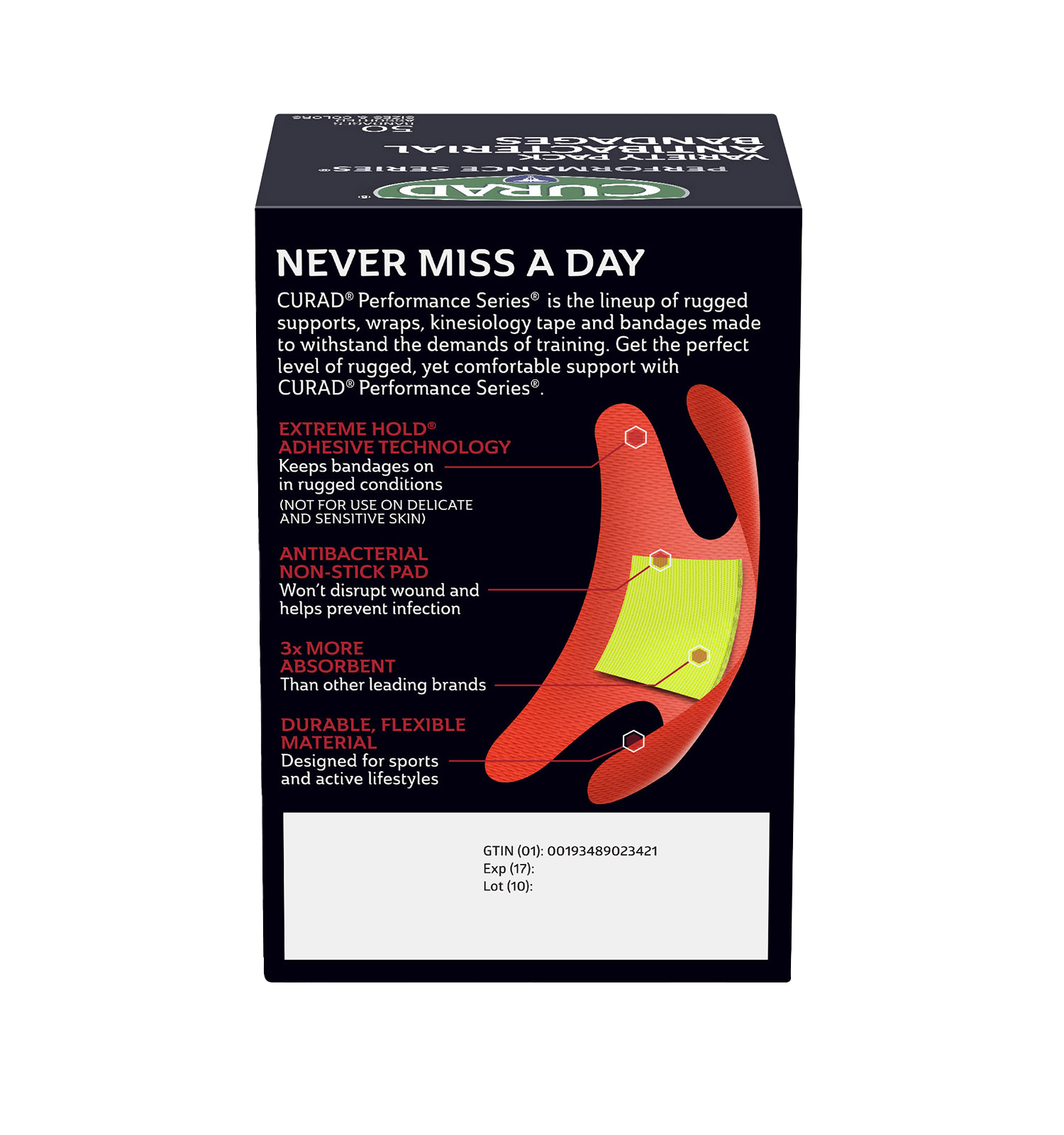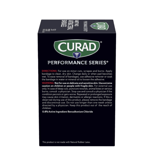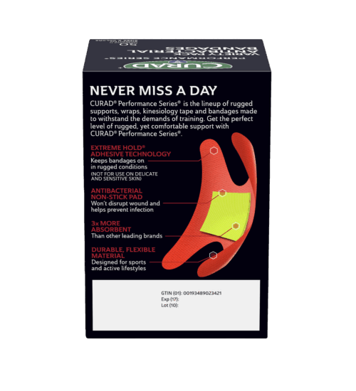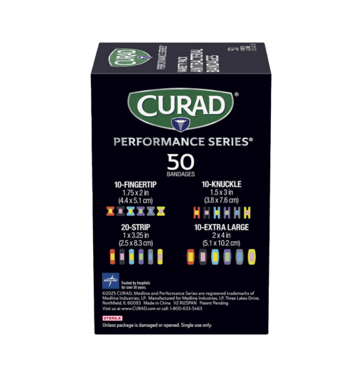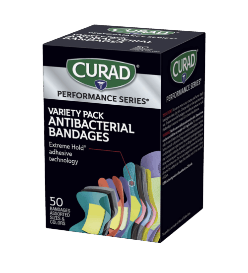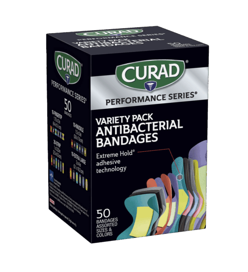 CURAD® Performance Series® Antibacterial Bandages – Variety Pack – features bandages for various uses, including fingertip, knuckle, strip, and extra-large bandages. The Extreme-Hold® Adhesive Technology provides athletes and active people the lasting protection they need in rugged conditions. The bandages stay on firmly until you take them off. The heavy-duty fabric is also breathable and flexible. The antibacterial, non-stick pad won’t disrupt your wound and works to prevent any infection.